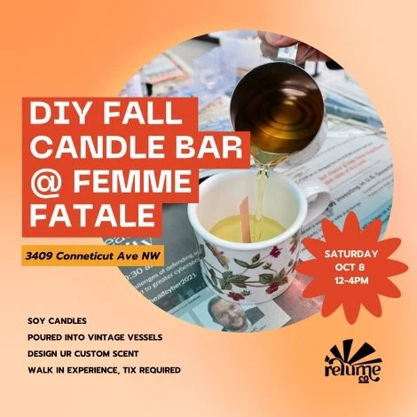 Pour your own soy candle with local candlemaker Lilly of Relume. You'll select your favorite vintage vessel, create a custom scent blend, and top the wax with crushed flower petals and more! Relume will guide you in this unique DIY experience, sending you home with a one-of-a-kind candle (and after burning, the container is ready to re-use.)