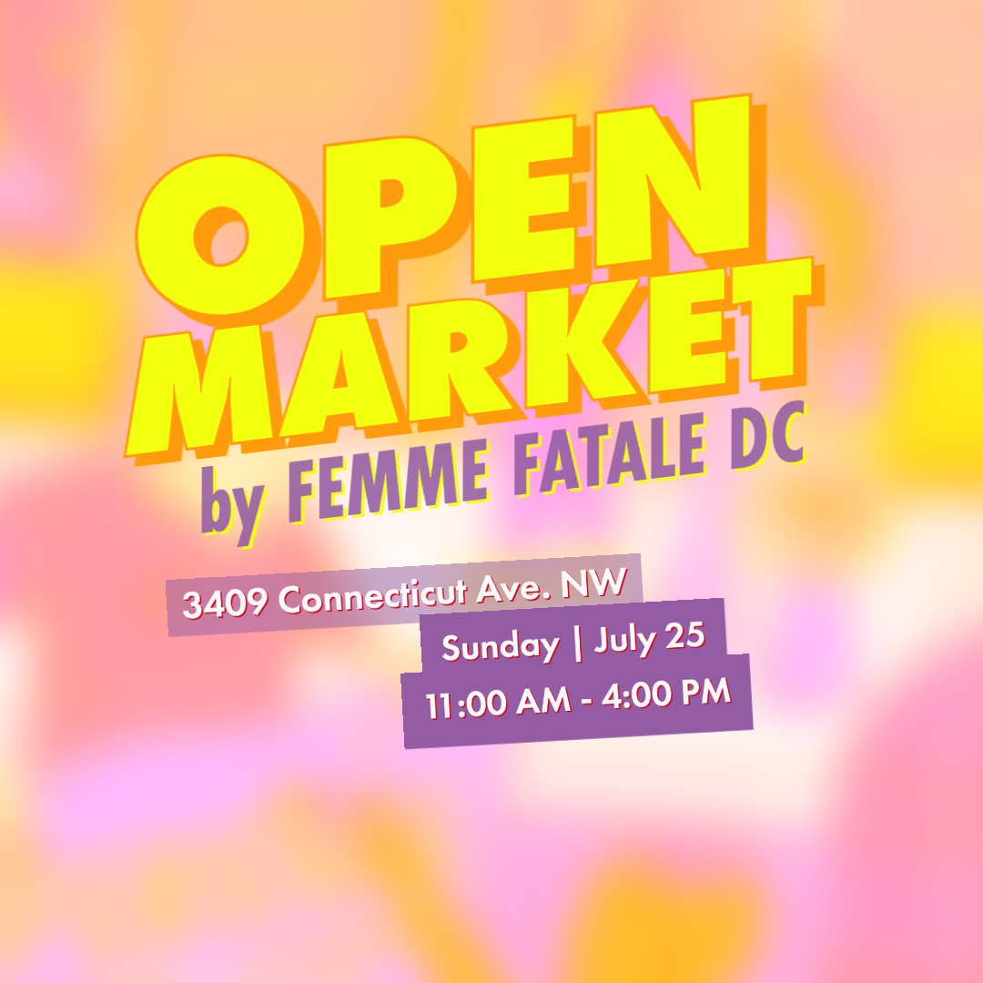 OPEN MARKET by Femme Fatale DC Sunday, July 25, 2021 2:00 PM 7:00 PM Google Calendar ICS HIT THIS BUTTON FOR OUR OPEN MARKET LINE-UP