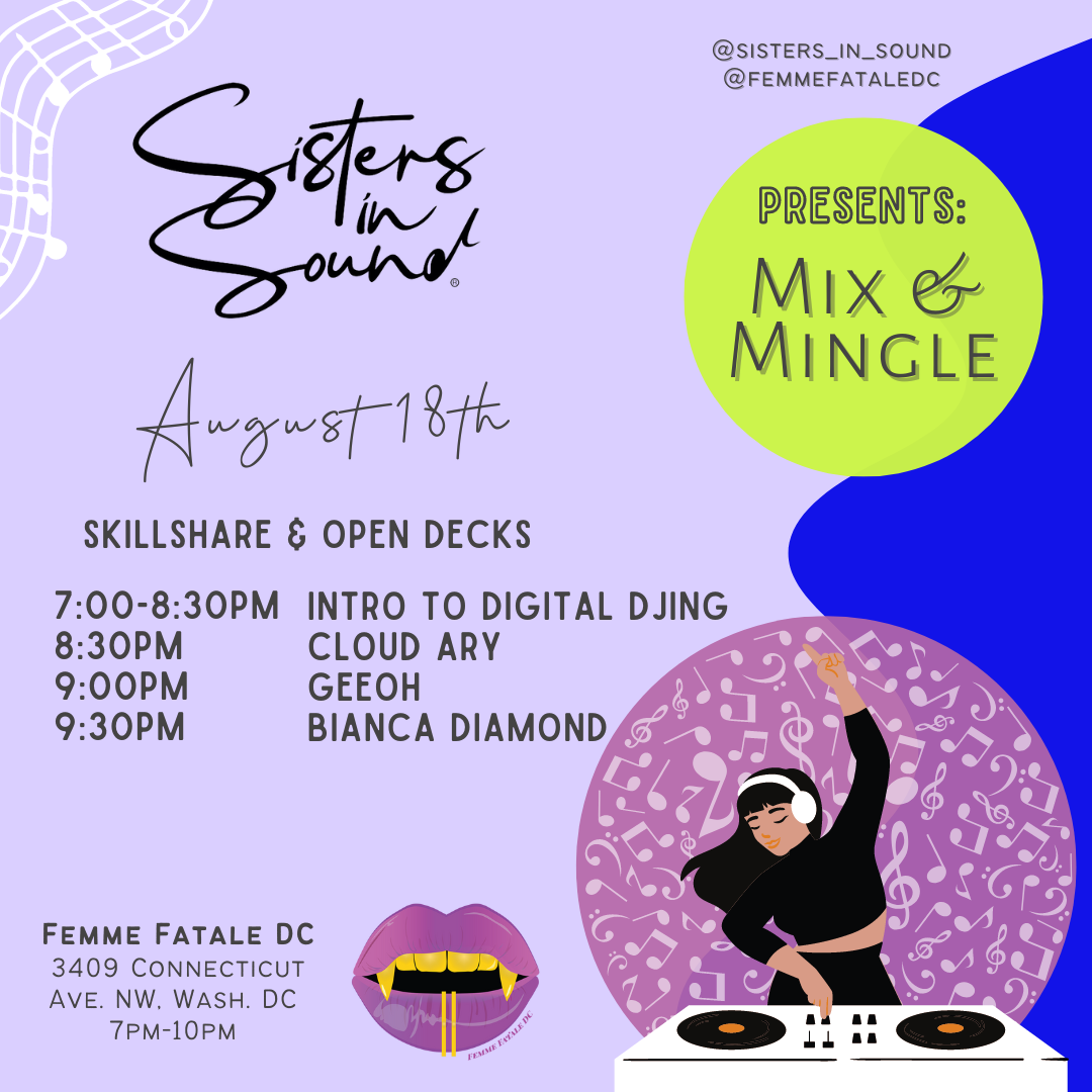 Come learn the basics of Digital Djing with Sisters in Sound. In this beginner oriented skillshare they will provide an overview of the mechanics, gear and theory behind the art of DJing. Hang with us afterwards for an open decks session featuring all women talent, drinks and as always the amazing Femme Fatale DC, showcasing local small businesses.