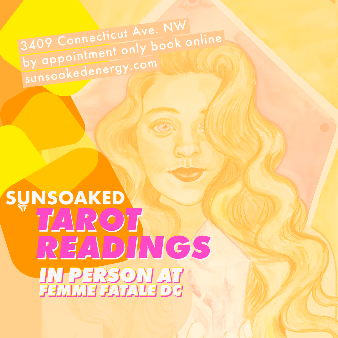 SUNSOAKED Crystals + Energy Practices is back at Femme Fatale DC offering by-appointment, in-person (can you believe it), Tarot readings. Book in advance on her website: click here.